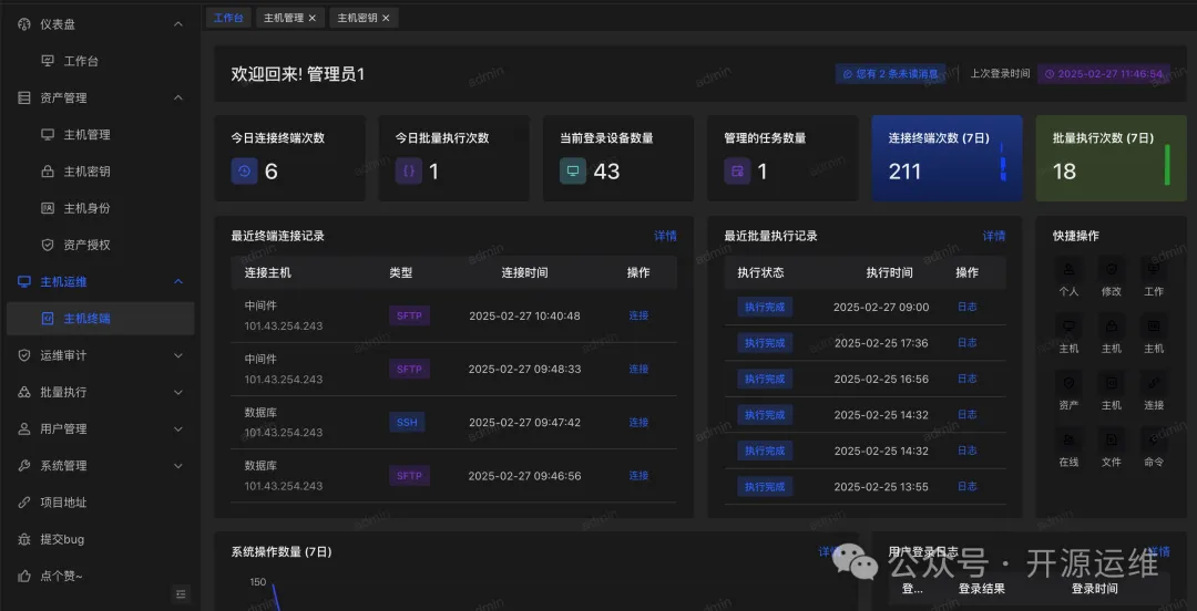 安全可靠: 作为堡垒机,安全是底线。它提供动态权限配置,完整记录用户操作日志,并具备简单的审计功能,为运维操作加上了一把“安全锁”。