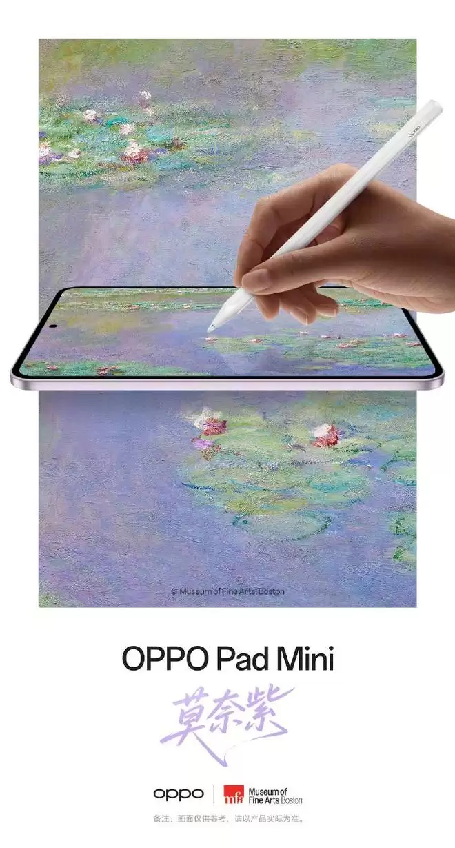 根据官方介绍,OPPO Pad Mini提供了莫奈紫、薄荷青以及深空灰三种颜色选择,整体风格主打“清新治愈、简约百搭”。其中,“莫奈紫”配色的来头不小,它是OPPO与波士顿美术博物馆携手共创的成果,设计灵感直接来源于莫奈画作中那些经典的紫色光影。