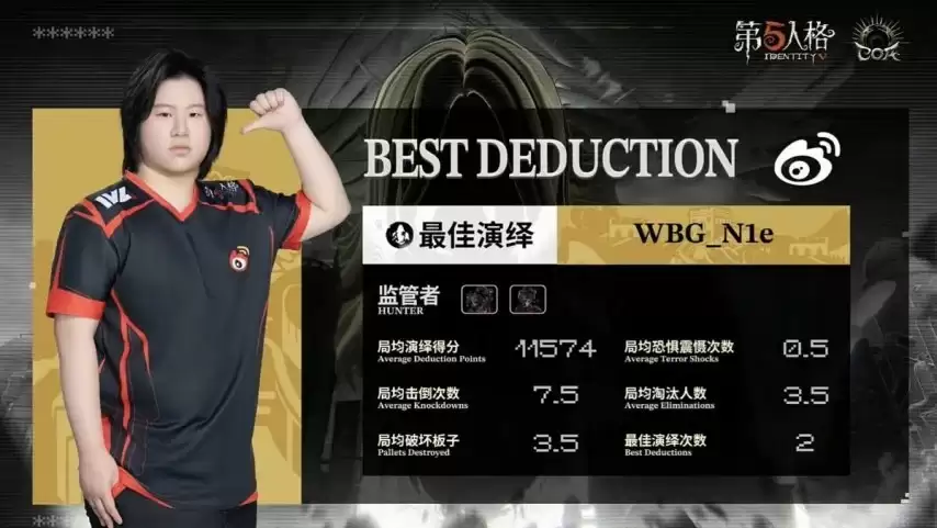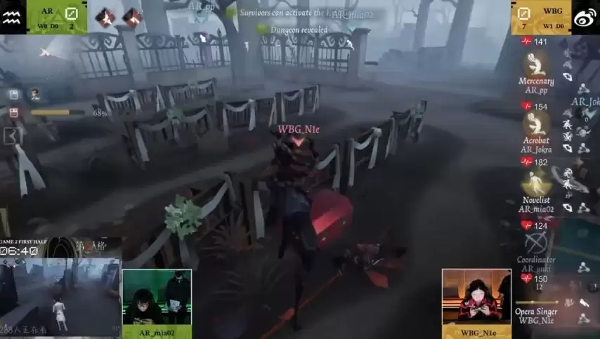 第二局上半场,北京WBG_N1e换用歌剧演员。开局他选择追击空军并成功将其击倒挂椅。杂技演员扛伤救下队友,但空军很快被再次击倒。佣兵随后挺身而出,扛伤救下空军并为其抵挡伤害,可惜空军最终仍被淘汰。歌剧演员趁势追击,将佣兵挂椅。小说家扛伤救下佣兵后自身被击倒。比赛进入关键阶段,歌剧演员利用“传送”技能精准击倒远处正在破译的杂技演员并挂椅。此时佣兵卡满恐惧值救下杂技演员,求生者方终于点亮全部密码机。然而在开门战环节,歌剧演员冷静操作,先后淘汰佣兵与杂技演员,完成三抓,为北京WBG锁定了整场比赛的胜利。