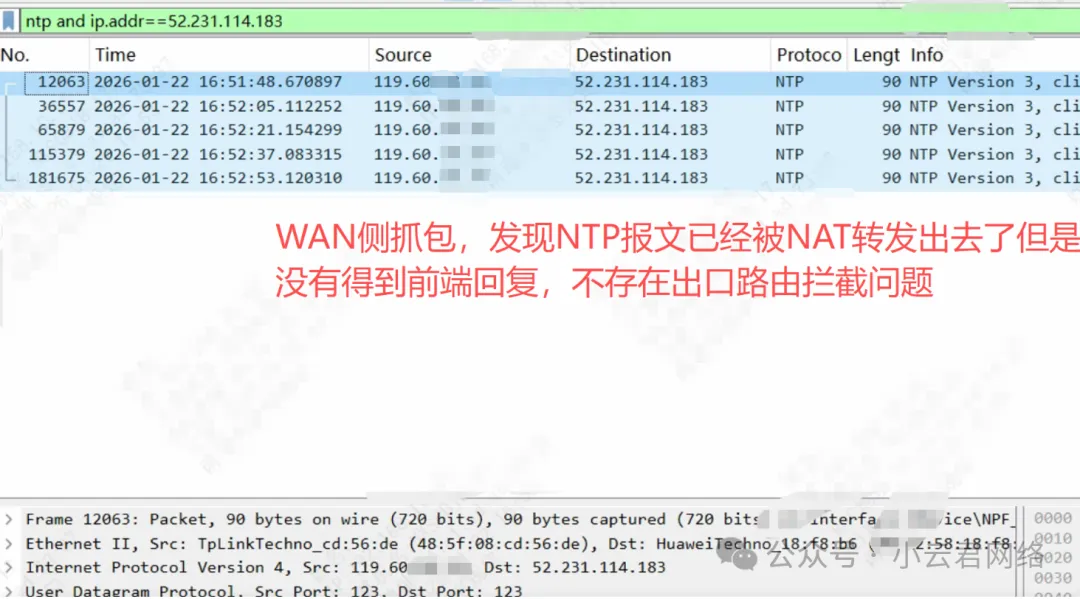 对比两张图,结论非常清晰:NTP请求报文已经成功通过路由器的NAT转换,发送到了外网。但是,从WAN口并没有看到任何来自前端的NTP回复报文。这说明,报文丢在了公网线路上,路由器本身并无拦截行为。