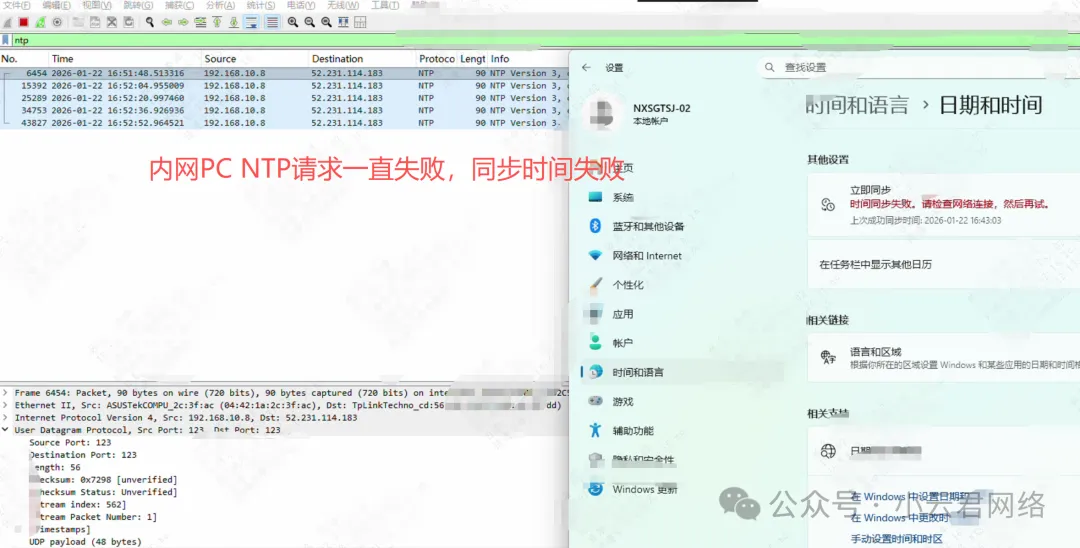 第一,验证时间服务器的网络可达性;第二,如果请求发出去了,就在网络路径上抓包,看NTP报文丢在了哪个节点;第三,对比电脑直连光猫和经过路由上网这两种情况,排查是否存在异常流量挤占了NTP协议所需的资源。