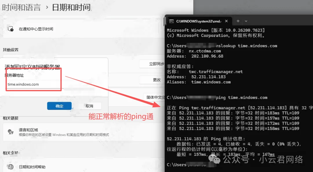在PC的时间同步设置页面,可以看到系统默认使用的服务器地址是 `time.windows.com`。二话不说,先ping一下看看。
