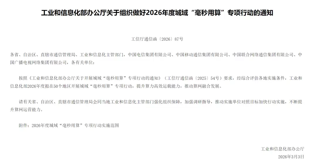 3月3日,工业和信息化部正式发布了《关于组织做好2026年度城域“毫秒用算”专项行动的通知》。通知明确,2026年度拟在50个地区开展城域“毫秒用算”专项行动,旨在提升算力高效运载能力,推动算网融合发展。