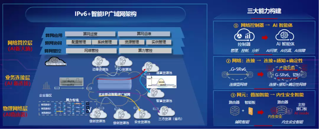 北京移动则积极推动IP网络从“连接赋能”向“AI赋能”升级,面向智算广域存算分离、算联网等场景,构建了灵活接入、弹性用算的网络基础设施。