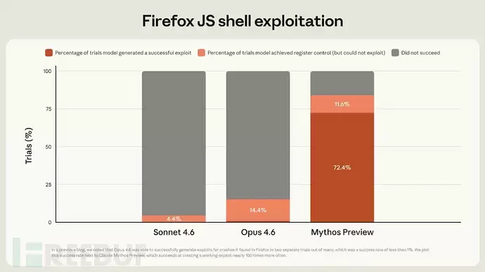 与Opus 4.6等前辈相比,Claude Mythos预览版实现了一次关键跨越。过去,模型或许能识别出漏洞的“病灶”,但要将其转化为精准的“手术刀”——也就是有效的攻击载荷——往往力有不逮。现在,局面不同了。在开源软件的内部测试中,新模型成功对10个完全打齐补丁的目标,完成了完整的控制流劫持。这背后的驱动力,并非简单的指令编程,而是模型在逻辑推理和自主编码能力上的整体跃升。