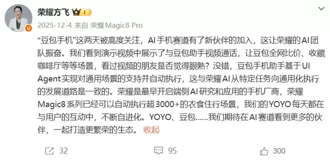 一个明确的信号出现在2025年12月。荣耀产品线总裁方飞在社交媒体上公开为豆包手机站台,她表示:“AI手机赛道有了新伙伴的加入,这让荣耀的AI团队很振奋。”她进一步阐释,豆包手机助手基于UI Agent实现通用场景支持与自动任务执行,这与荣耀AI从特定任务向通用化执行演进的发展路径高度契合。