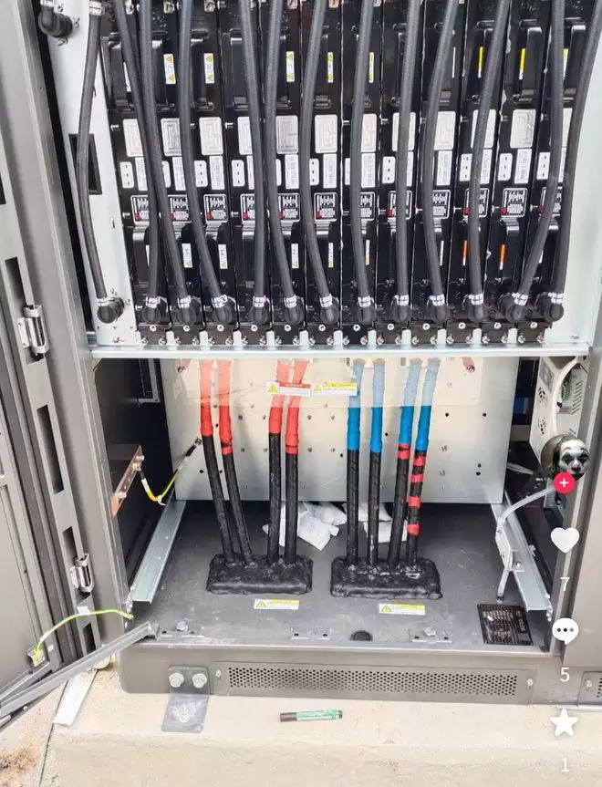 两个储能柜是电量的“蓄水池”,每个柜子里装着四个电池包。以主流规格为例,单个电池包额定容量42.3度电,那么两个柜子总储备就是338.4度电。也有部分站点采用46度电的电池包,总电量则为185度电。这个电量规模,如果跟蔚来换电站里那二十多块可换电池比起来,确实不算大。但别急,真正的玄机在旁边的充电主机里。