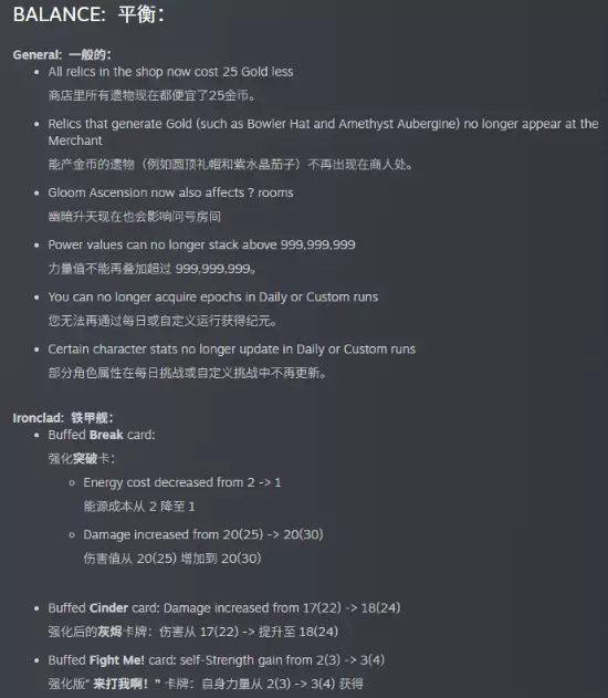 如果说美术更新是游戏的“面子”,那么平衡性调整无疑是本次更新的“里子”。公告中列出的平衡项目相当繁杂,涉及大量卡牌数值、核心机制以及遗物效果的改动,具体列表建议玩家查阅完整公告。