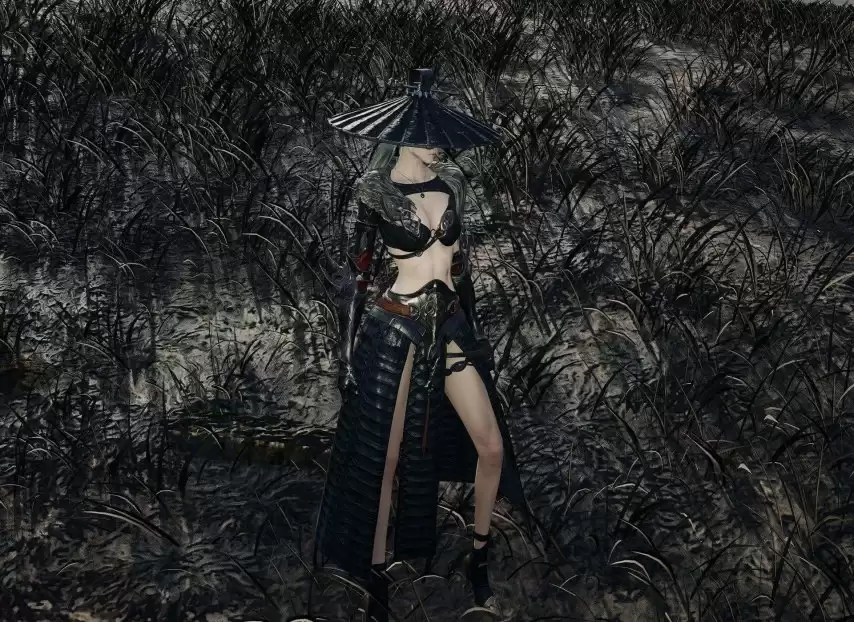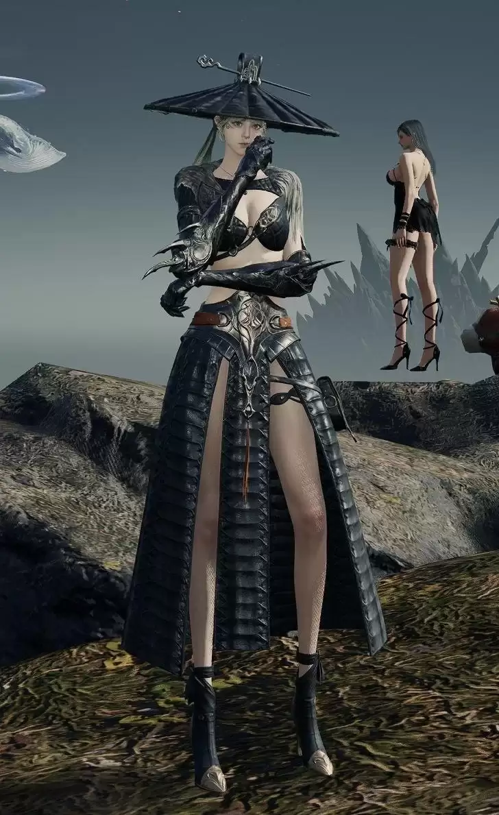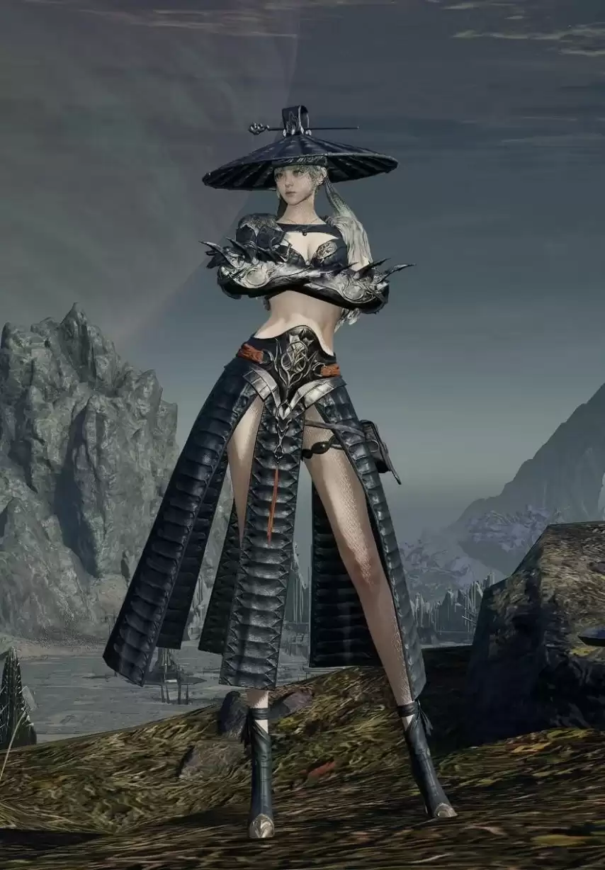 首先是一套充满东方武侠意境的外观。整体塑造出一位头戴斗笠、身着玄衣的飒爽女侠形象。然而,其设计精髓在于细节:服装下摆采用了极高开衩的剪裁,从多个视角观察,都营造出一种巧妙的“视觉留白”效果。这种处理手法,在当前视觉呈现下,更倾向于构建一种“若隐若现”的审美感受。