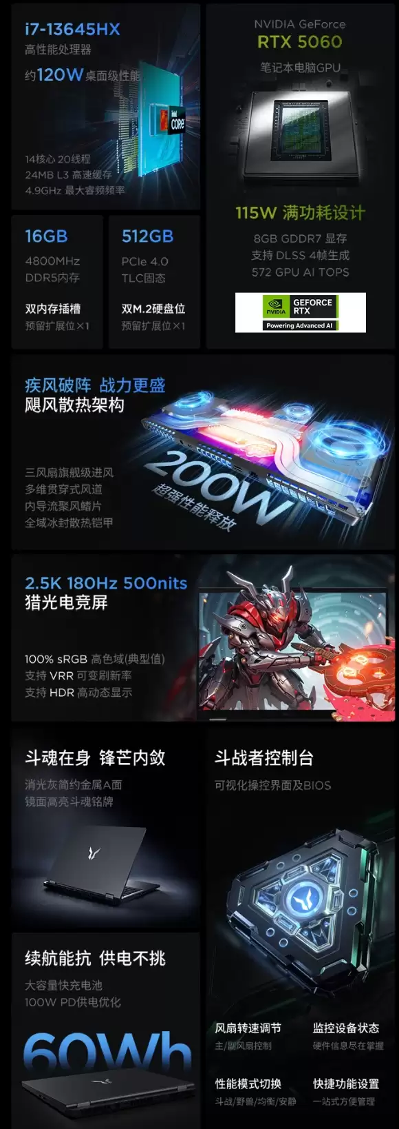 图形性能方面,其内置的NVIDIA RTX 5060笔记本电脑GPU拥有115W的满功耗设计,支持DLSS 3.5等先进技术,能够在2K分辨率下流畅运行主流光追游戏。为了确保硬件性能持续稳定释放,笔记本采用了三风扇、四热管、多区进出风的霜刃散热系统,有效控制核心温度,避免因过热降频而影响游戏帧数。