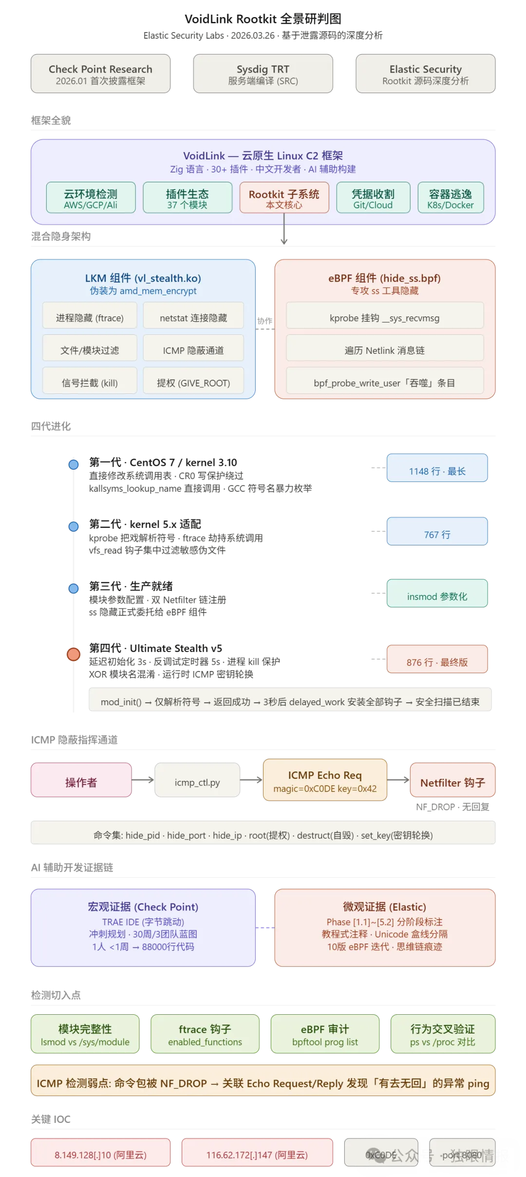 通常来说,Linux rootkit开发者会选一条路走到黑:要么用LKM(可加载内核模块)直接劫持系统调用表,要么用eBPF挂钩内核追踪点,再不济就在用户态通过LD_PRELOAD做手脚。但VoidLink偏偏不走寻常路,它把LKM和eBPF的长处都拿了过来,拼成了一个混合架构。Elastic的研究人员明确指出,这种双组件设计在野外样本里极为罕见。