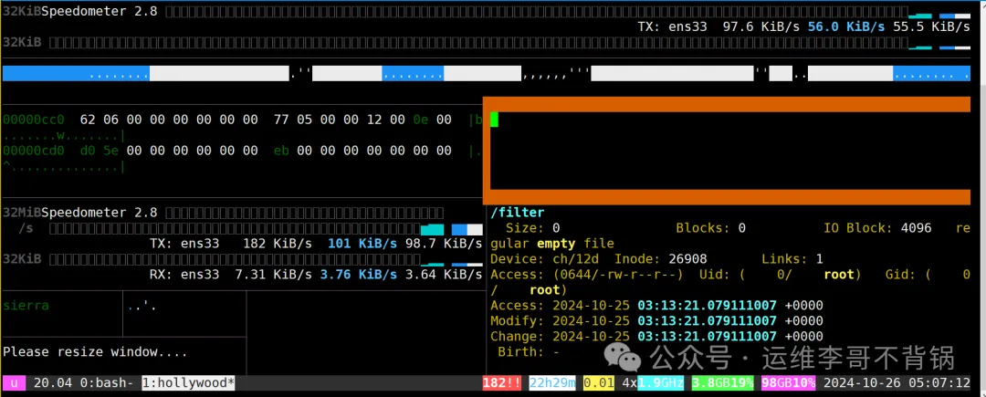 最后这个工具,堪称“摸鱼”利器或“假装很忙”终极方案。hollywood会在你的终端中分屏展示多种炫酷的界面,比如代码滚动、系统监控、网络流量等,完美复刻好莱坞电影里黑客的屏幕,气场十足。