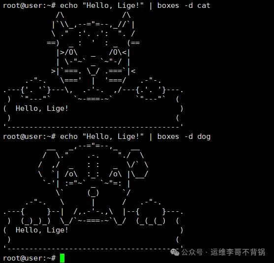 使用echo输出文本,并通过管道传递给boxes,选择你喜欢的图案(如猫、狗):