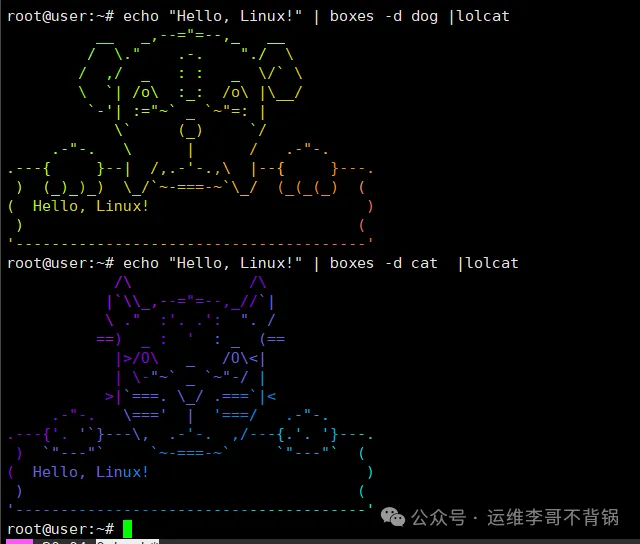 echo "Hello, Linux!" | boxes -d dog | lolcat