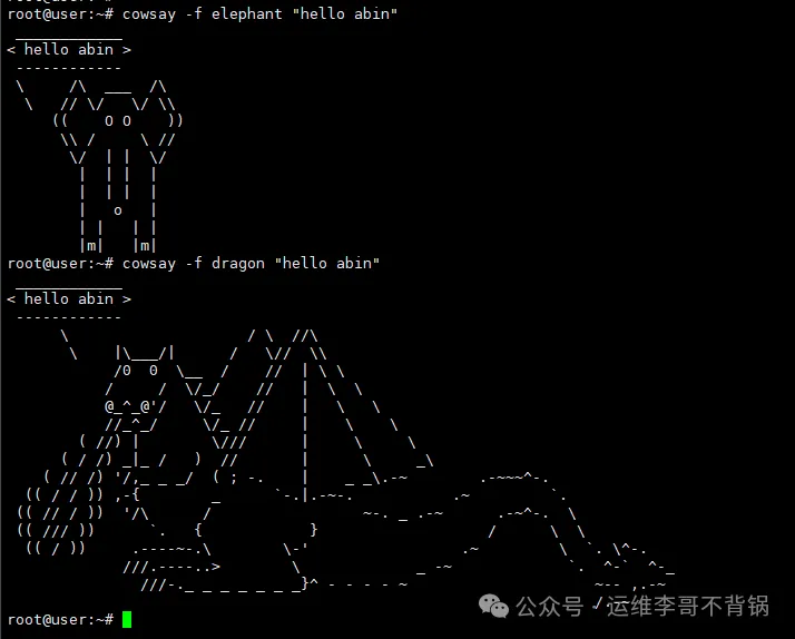 cowsay -f elephant "hello abin"