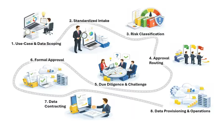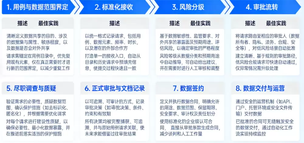 那么,如何在保障安全与控制的前提下,不让数据共享成为业务创新的绊脚石?关键在于建立一套兼顾“速度”与“控制”的端到端审批流程。其目标不是给团队设限,而是提供一套清晰、可重复的“游戏规则”,用以评估风险、指导决策、记录过程,并最终确保数据无论流向何处,其访问都是安全的。