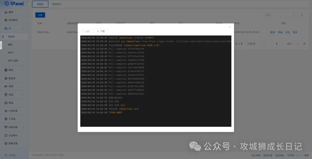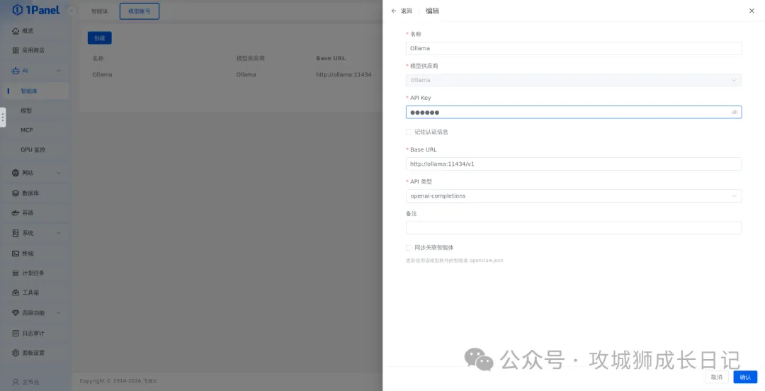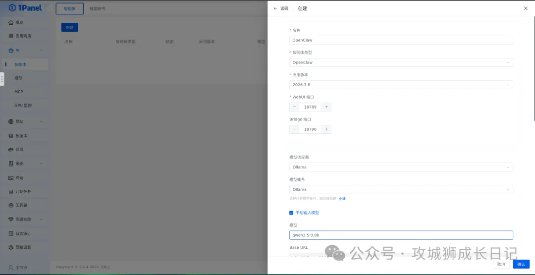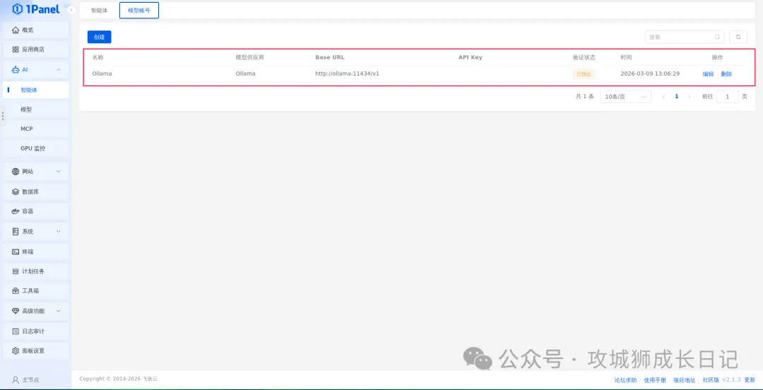 在1Panel中安装OpenClaw之前,需要先配置模型账号。进入1Panel面板,依次点击“AI”下拉菜单 -> “智能体” -> “模型账号” -> “创建模型账号”,如下图所示: