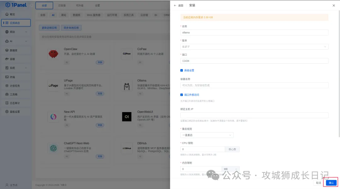 首先,从1Panel首页进入“应用商店”,在“AI/大模型”分类下找到Ollama,点击“安装”按钮。