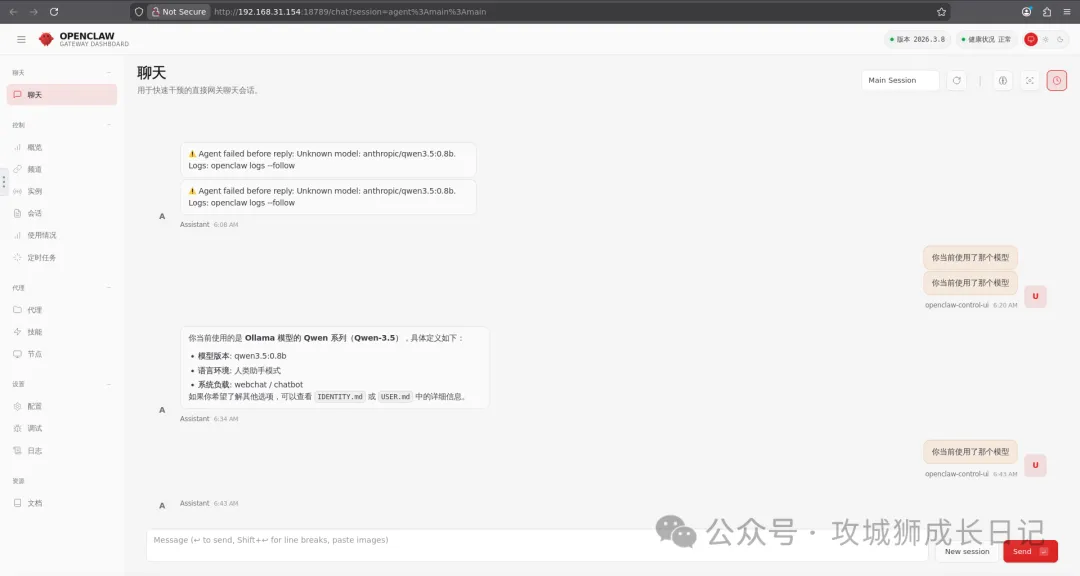 浏览器将跳转至访问地址:服务器IP:18789/?token=你的OpenClawToken。接下来,您就可以在这个WebUI界面中进行其他配置并与AI助手对话了。