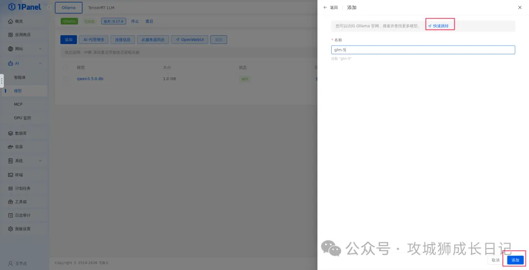 如果不知道需要下载哪些模型,可以通过“快速跳转”功能,跳转到Ollama官方模型库进行搜索和选择。