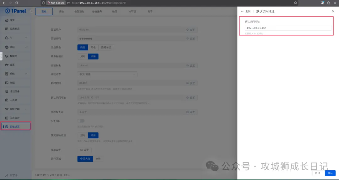 接下来,点击“面板设置”,找到“默认访问地址”进行设置,填入自己服务器的IP地址,点击确认。