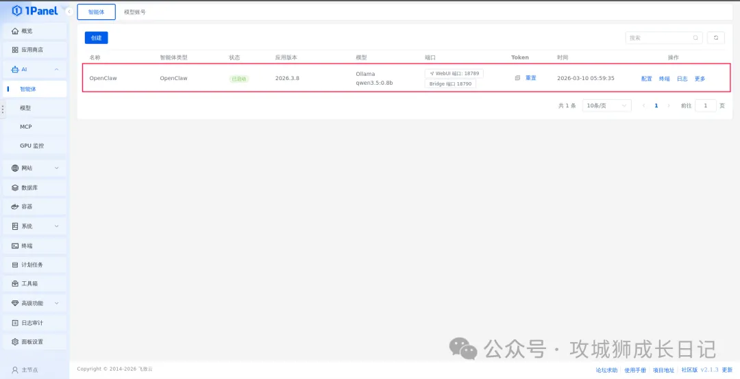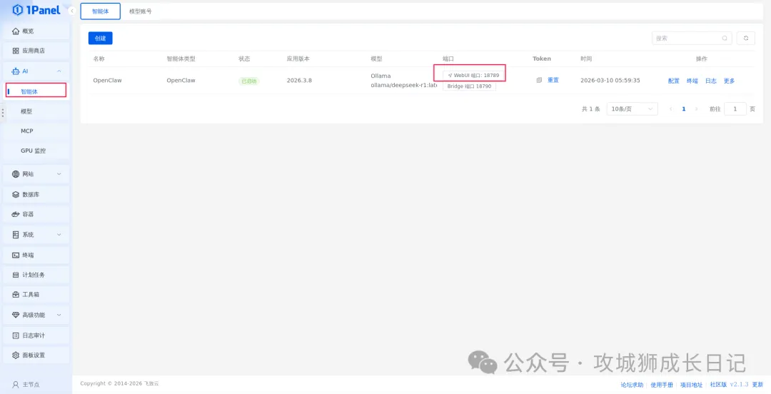然后,依次点击“AI” -> “智能体”,找到刚创建的OpenClaw智能体,点击其“WebUI 端口”按钮。