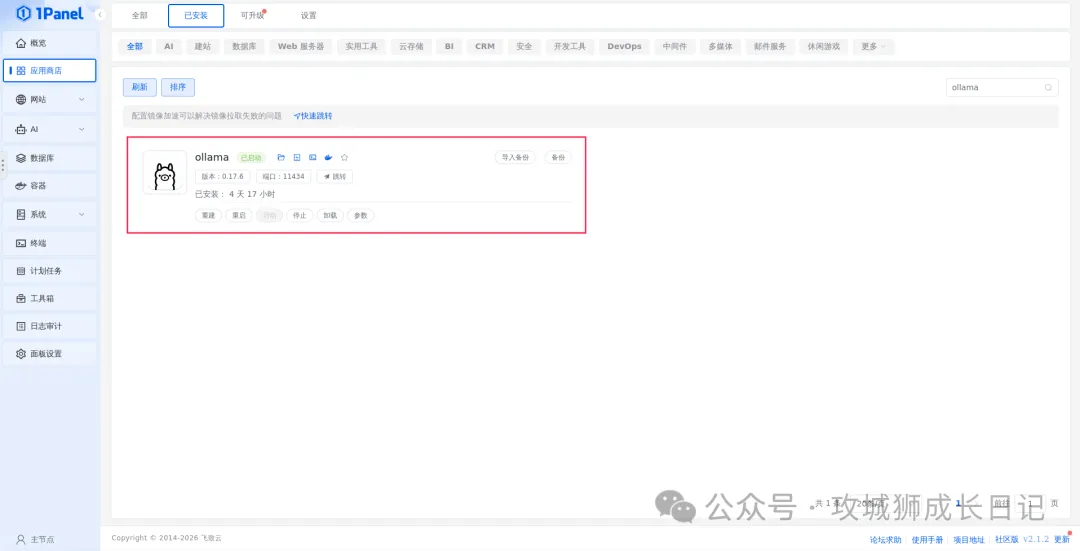 Ollama安装成功后,在1Panel操作界面中返回应用商店的“已安装”标签页,即可看到Ollama已安装成功。