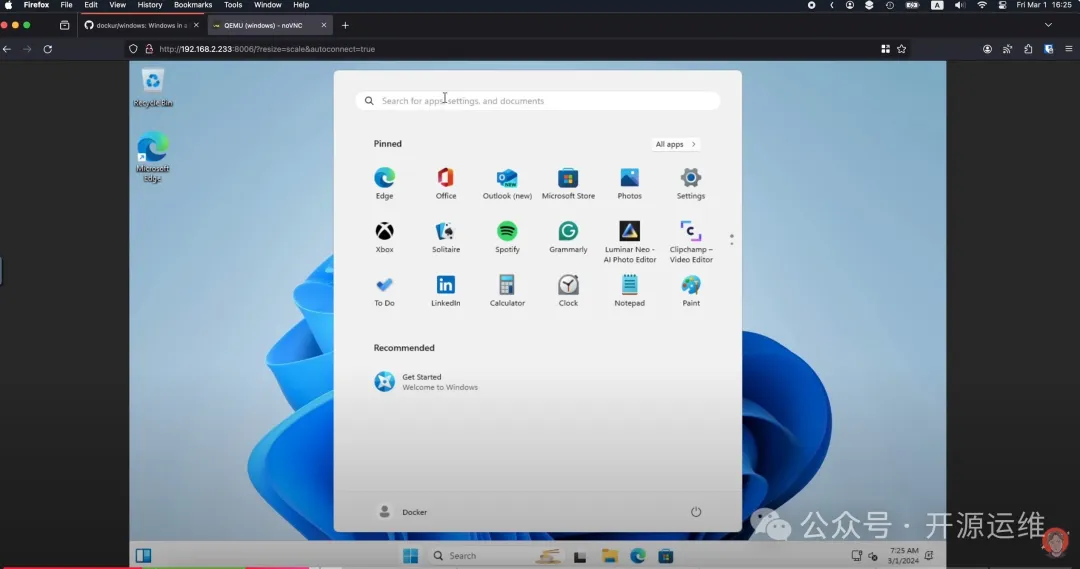 连接系统: 安装完成后,打开你常用的RDP客户端,地址填写 localhost 或宿主机IP。使用默认的用户名(通常是 Docker)和空密码进行连接,即可成功登录并看到完整的Windows桌面环境。