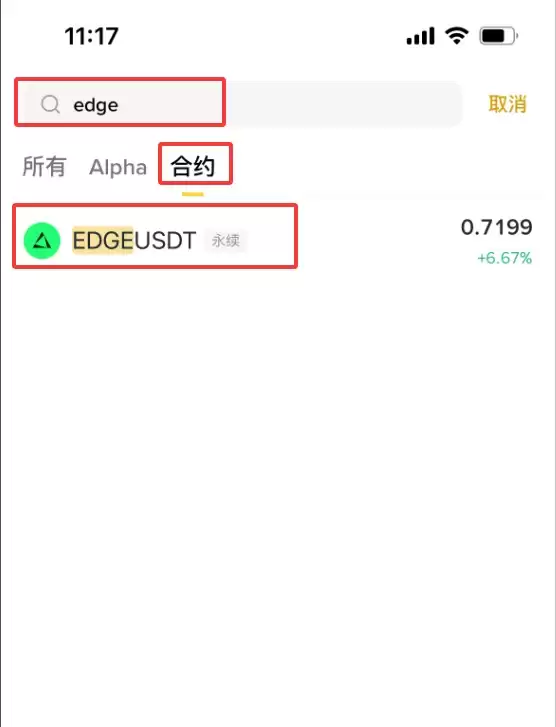 输入“EDGE”,在下拉结果中找到并点击【EDGEUSDT】永续合约。