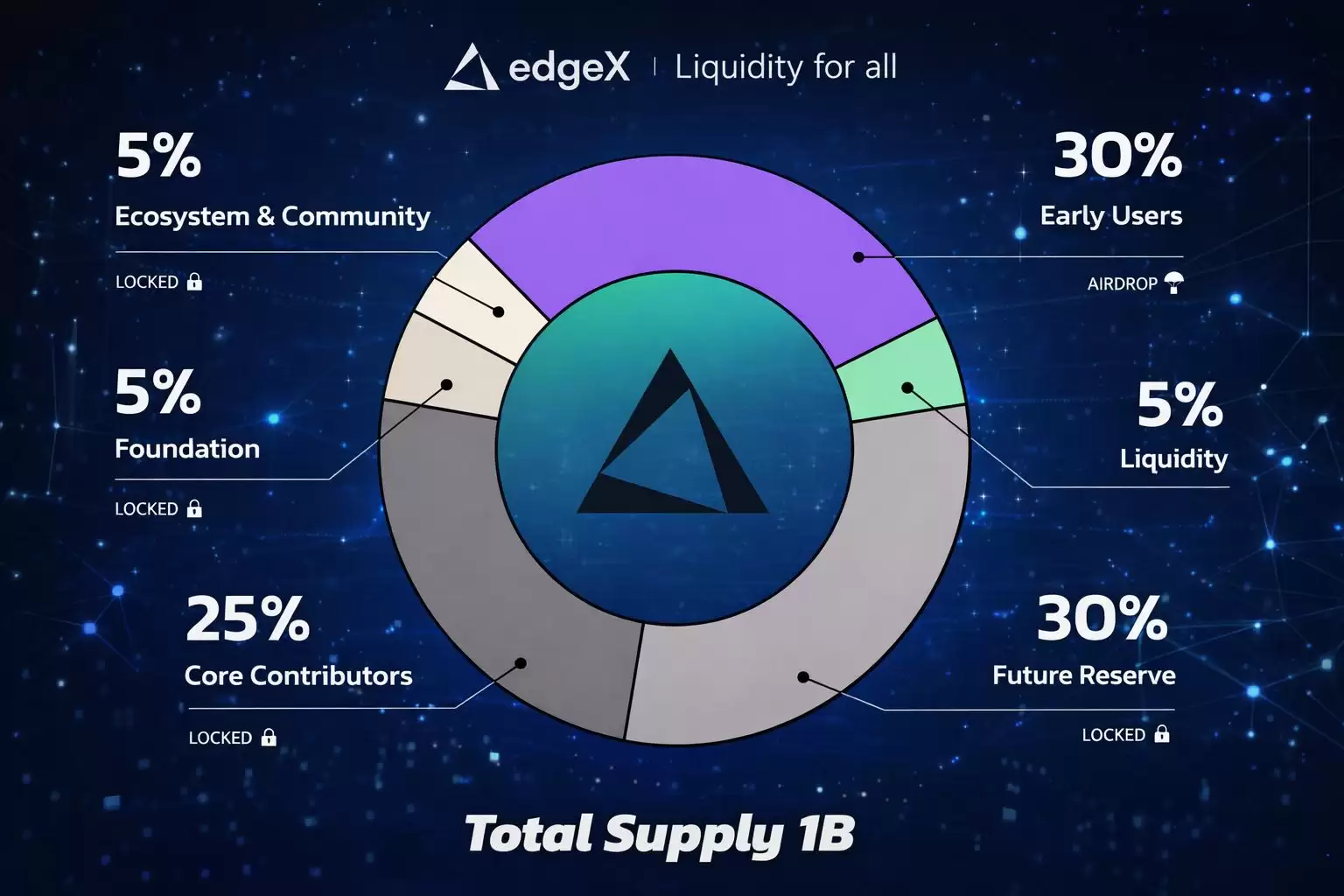 EDGE 代币的总供应量上限为 10 亿枚,其分配方案旨在平衡社区激励、生态发展、长期规划与团队贡献。根据官方信息,30% 的份额分配给了早期用户,这包括 25% 的创世分发和 5% 的 Pre-TGE 季节奖励。其余部分的分配比例如下:流动性提供(5%)、生态系统与社区发展(5%)、基金会储备(5%)、未来战略储备(30%)以及核心贡献者(25%)。