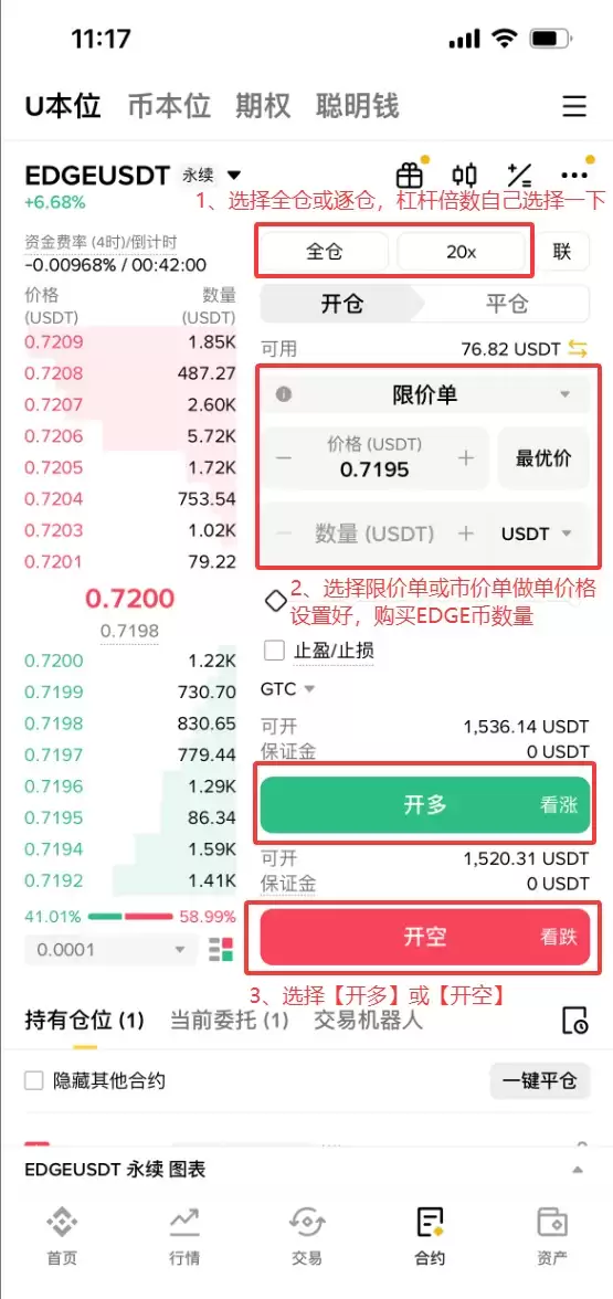 依次选择【全仓】或【逐仓】模式,调整杠杆【倍数】,选择【限价】或【市价】下单方式,输入【价格】和【数量】,最后点击【做多】或【做空】按钮完成下单。