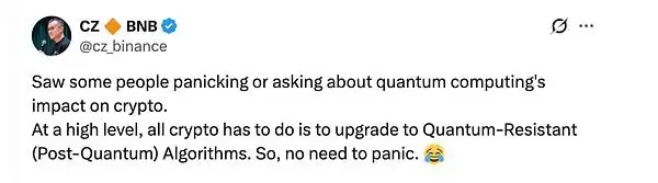 Bitfinex研究团队的解读代表了市场普遍的冷静态度:“目前远未构成生存性威胁,投资者没有必要恐慌。”CZ(赵长鹏)也在社交媒体上简洁回应:“升级算法就可以解决。”