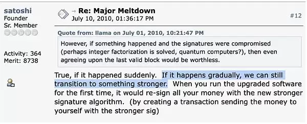 其实,比特币的创造者中本聪早在2010年,就在Bitcointalk论坛上讨论过量子计算的潜在威胁。他当时就极其清醒地指出:比特币的安全假设并非永恒不变,但密码算法本身是可以被替换的。