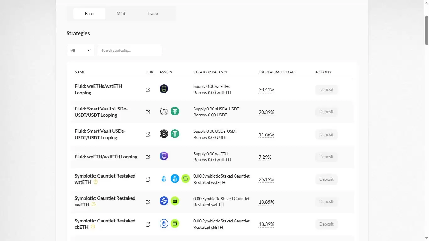 “赚取”功能的核心是收益策略。用户可以对持有的积分资产应用不同策略,以获得额外收益。不同的代币对应不同的策略,并提供差异化的年化收益率(APR)。这些策略包括提供流动性、借贷等,旨在最大化存入资产的利用率。举个例子,用户可以存入 weETH,以其为抵押借款,然后再将借出的资金进行再投资,从而放大收益潜力。