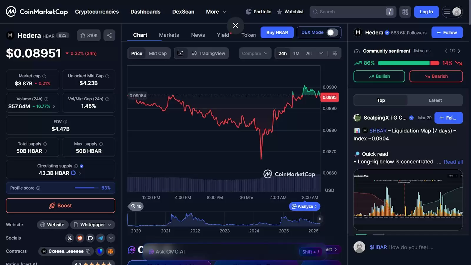 先看实时数据:目前,HBAR的价格位于0.08951美元附近。过去一天并不平静,其价格经历了超过16%的波动,这在一定程度上反映了当前加密市场的整体情绪。尽管如此,凭借约38.7亿美元的市值和41.6亿美元的未锁定市值,Hedera依然是主流加密资产中不可忽视的参与者。日交易量维持在4114万美元的水平,换算成成交量与市值之比约为1.48%,显示出市场具备不错的流动性。如果按500亿枚的总供应量全部流通计算,其完全稀释后的市值将达到约44亿美元。
