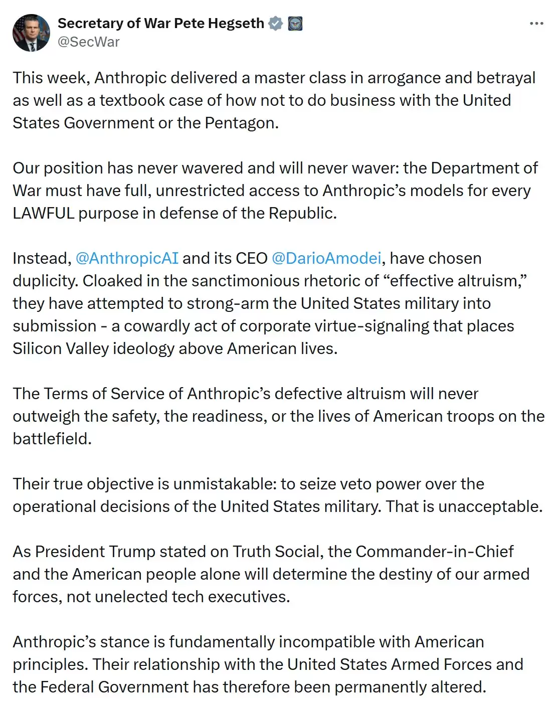 来源:国 防 部 长 皮特·赫格塞斯