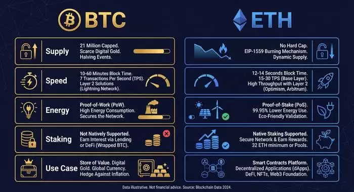 | 核心目标 | 数字黄金,价值存储 | 智能合约平台,去中心化应用 |
