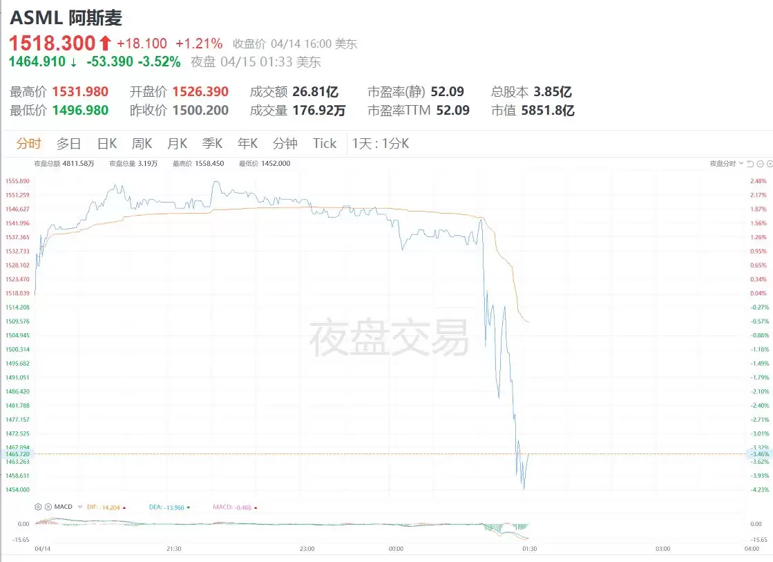 阿斯麦美股夜盘跳水跌超4%,Q2展望略逊预期