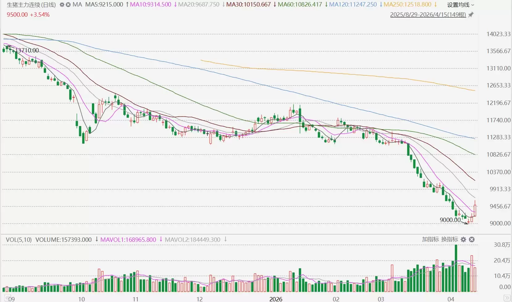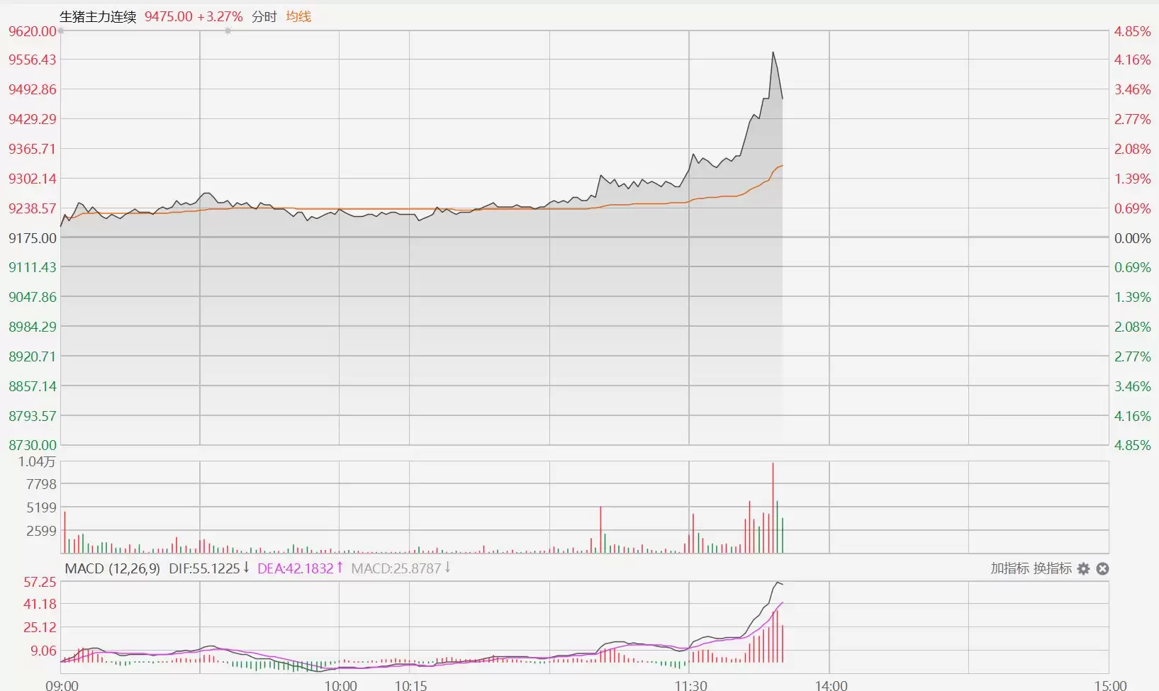 生猪期货市场释放强劲看涨信号:主力合约今日盘中大幅拉升,最高涨幅逼近5%,报价一度触及9620.00元/吨关键位置。这已是该合约连续第二个交易日强势收涨,行情表现引发市场高度关注。