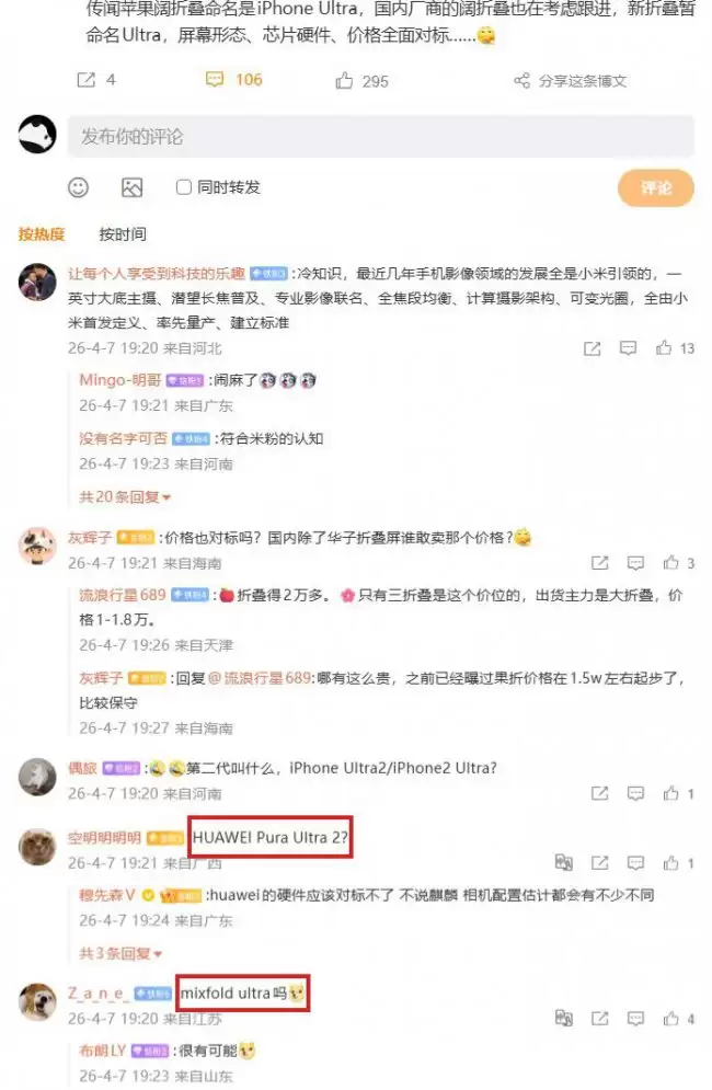 虽然博主没有指名道姓,但评论区早已热闹非凡。不少网友猜测,这款神秘新机可能是华 为的Pura Ultra 2,或者小米的MIX Fold Ultra。当然,这些都还只是坊间猜测,并非官方信息,咱们先看个热闹。