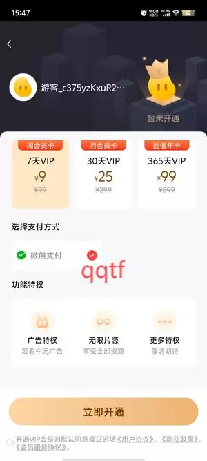 最后一步,在会员开通页面,您可以根据自己的需求,从月度、季度或年度等多种会员时长中选择最合适的一项。确认选择后,点击立即支付,并按照您熟悉的支付方式(如微信支付、支付宝等)完成付款。支付成功后,您的会员身份将立即激活,即刻享受包括去广告、蓝光高清、会员专享片库以及提前看剧等全部特权。