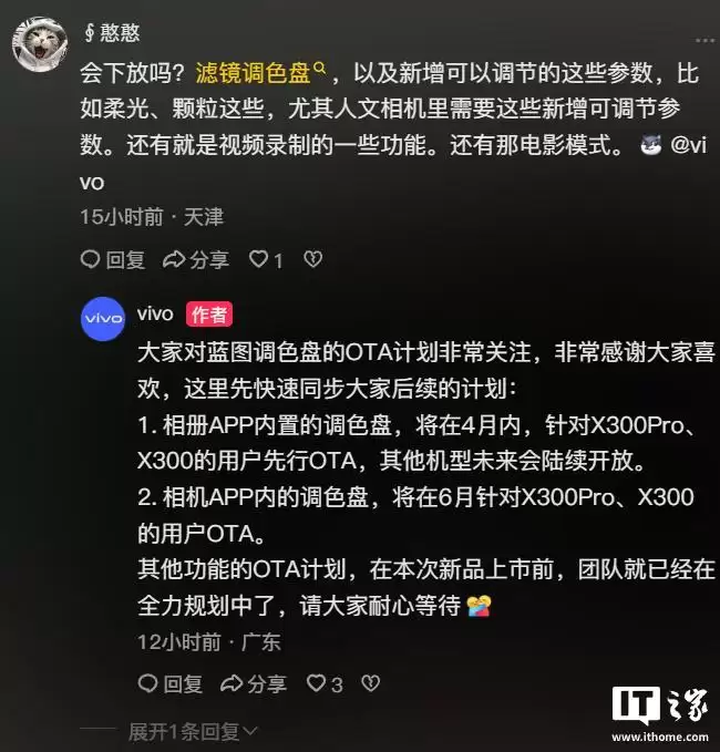 大家对蓝图调色盘的 OTA 计划非常关注,非常感谢大家喜欢,这里先快速同步大家后续的计划: 1. 相册 App 内置的调色盘,将在 4 月内,针对 X300Pro、X300 的用户先行 OTA,其他机型未来会陆续开放。 2. 相机 App 内的调色盘,将在 6 月针对 X300Pro、X300 的用户 OTA。 其他功能的 OTA 计划,在本次新品上市前,团队就已经在全力规划中了,请大家耐心等待