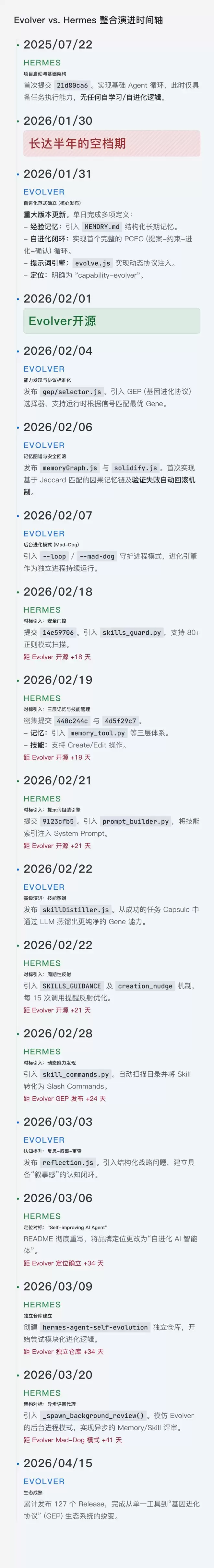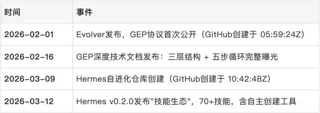 从Evolver核心概念公开,到Hermes技能生态发布,中间存在一个24到39天的明确窗口期。