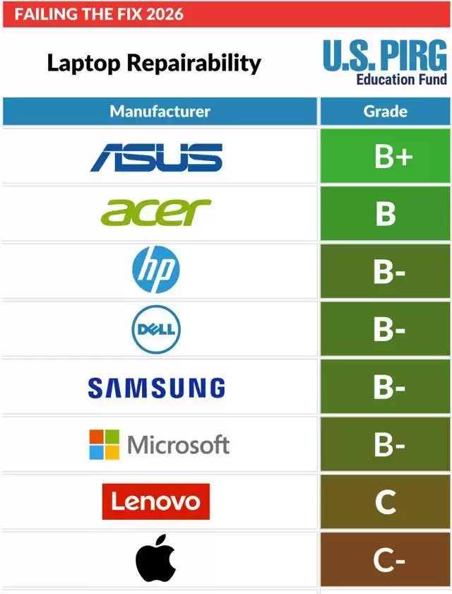 报告总结道,在美国最主流的八大笔记本品牌中,多数产品的可维修性“整体上停滞不前”。普罗克特也表示,与几年前相比,消费者从厂商那里获取零件、工具和维修信息的渠道确实有所改善,但在设备实体结构设计层面,拆解便利性的提升往往需要更长的周期才能体现在终端产品上。话虽如此,报告也对部分厂商尝试推出更易维修的设计表示了肯定,其中就包括苹果最新的MacBook Neo——这款产品在结构设计和维修友好度上,被视为“朝正确方向迈出的一步”。