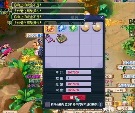 交易前的准备工作至关重要。一是确保背包留有充足空间,二是备好足额的梦幻币。此外,云游道人处商品的价格为动态浮动,会随全服购买总量而变化。若对当前报价不满意,请务必勾选界面中的“实际价格与显示价格不同时不进行购买”选项,以避免误操作造成不必要的经济损失。