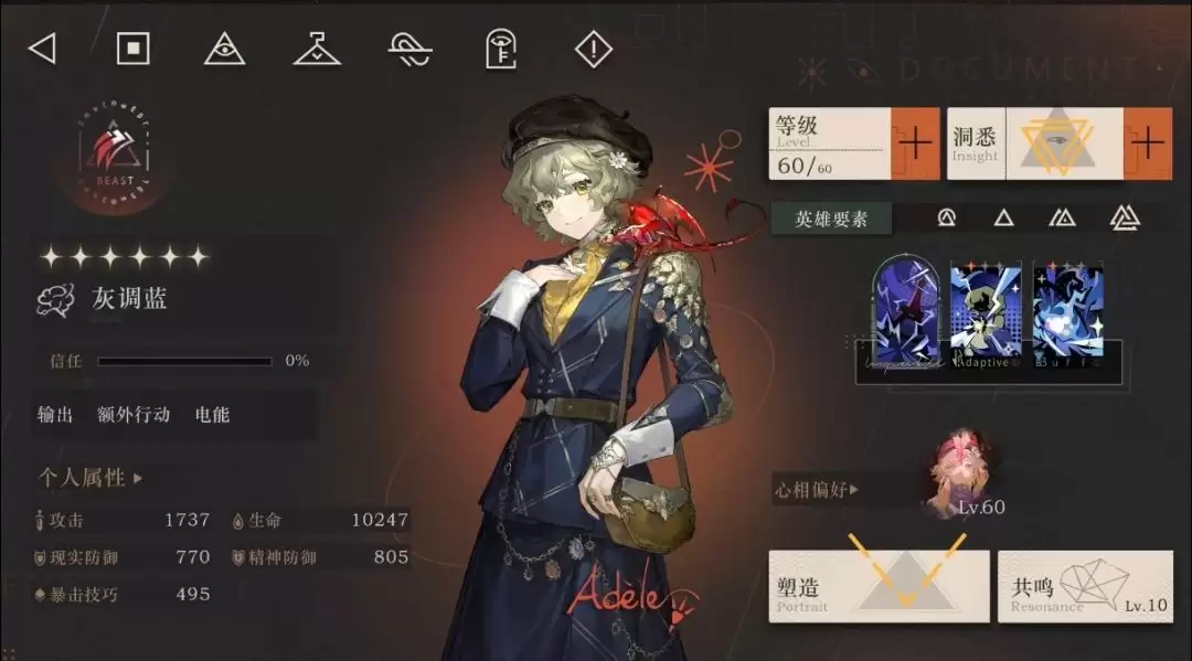 灰调蓝是一位以精神创伤输出为主的“形态切换角色”。她的伤害核心依赖于独特的“热电效应”层数叠加,同时能为全队提供高覆盖率的防御降低与伤害加成效果。这种设计让她在战场上能灵活切换于副C与增伤辅助之间,战术适应性极强。