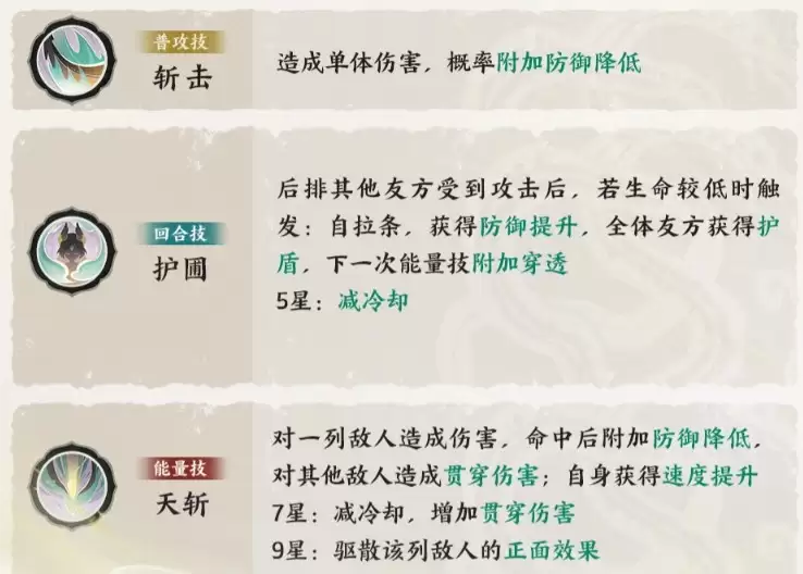 能量技“天斩”是英招进行群体输出与战略压制的王牌。该技能会对敌方一列单位造成高额雷系范围伤害,命中首要目标后施加防御降低效果,并对同列其他敌人发动强力的贯穿伤害,同时还能提升英招自身的速度属性。此技能成长性极高:升至七星时,冷却时间减少,贯穿伤害比例提升;达到九星后,技能将新增强效驱散效果,可直接清除该列所有敌方单位的正面增益状态。因此,一个高星阶的英招,对于依赖增益Buff(如攻击提升、防御强化等)的敌方阵容具有极强的克制与压制能力。