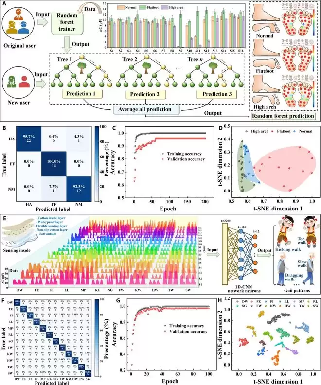 当然,硬件采集的足底压力数据只是原始信息,真正的价值在于解读。鞋垫通过16通道无线模块实时传输数据,而嵌入的人工智能算法则扮演了“解码者”的核心角色。经过充分训练,系统对足弓异常的识别准确率达96%,对12种病理步态的综合分类准确率更是高达97.6%,涵盖帕金森病慌张步态、脑卒中偏瘫步态等多种复杂情况。