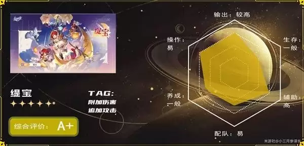 泛用性极高的全能辅助角色,核心优势在于能辅助主C进行一定补刀输出,并提供以真实伤害为媒介的独立增伤乘区。缇宝尤其适配攻击频率高或具备优秀对群能力的角色(满足其一即可),覆盖场景广泛,可以作为一块优秀的通用拼图灵活嵌入多种队伍构建中。