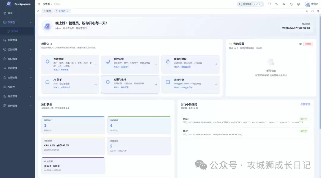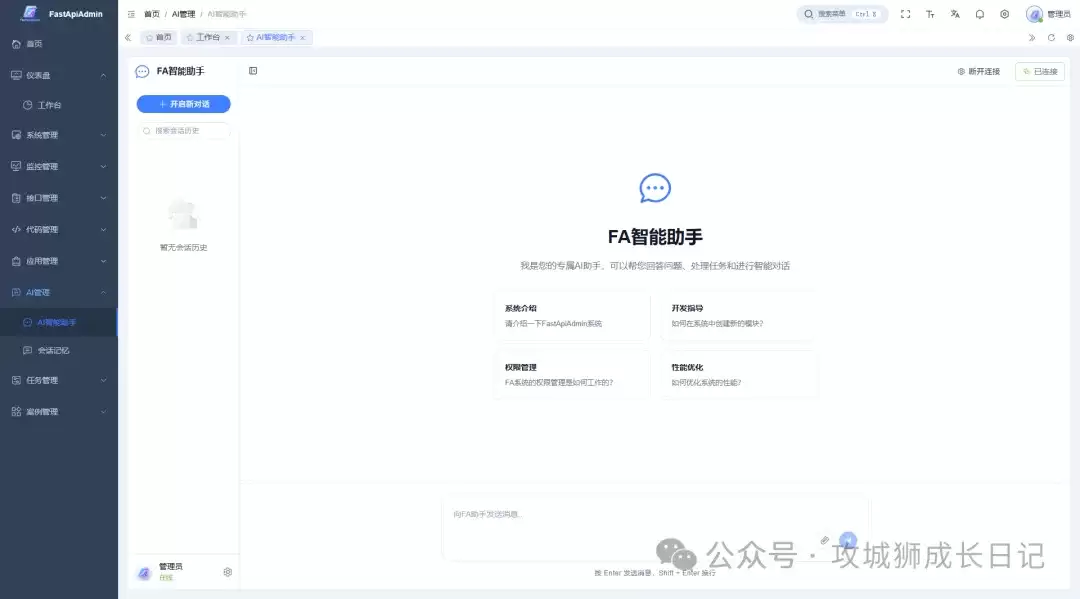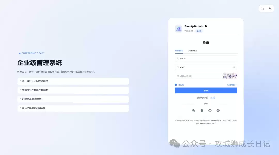 FastApiAdmin是一个开源且高度模块化的快速开发平台,其设计目标就是帮助开发者高效构建高质量的企业级中后台系统。它巧妙地将Python后端的FastAPI框架与前端的Vue3结合起来,实现了前后端分离的多终端一体化开发体验。无论你是刚入门的新手,还是经验丰富的资深开发者,都能享受到这种一站式、开箱即用的便捷。